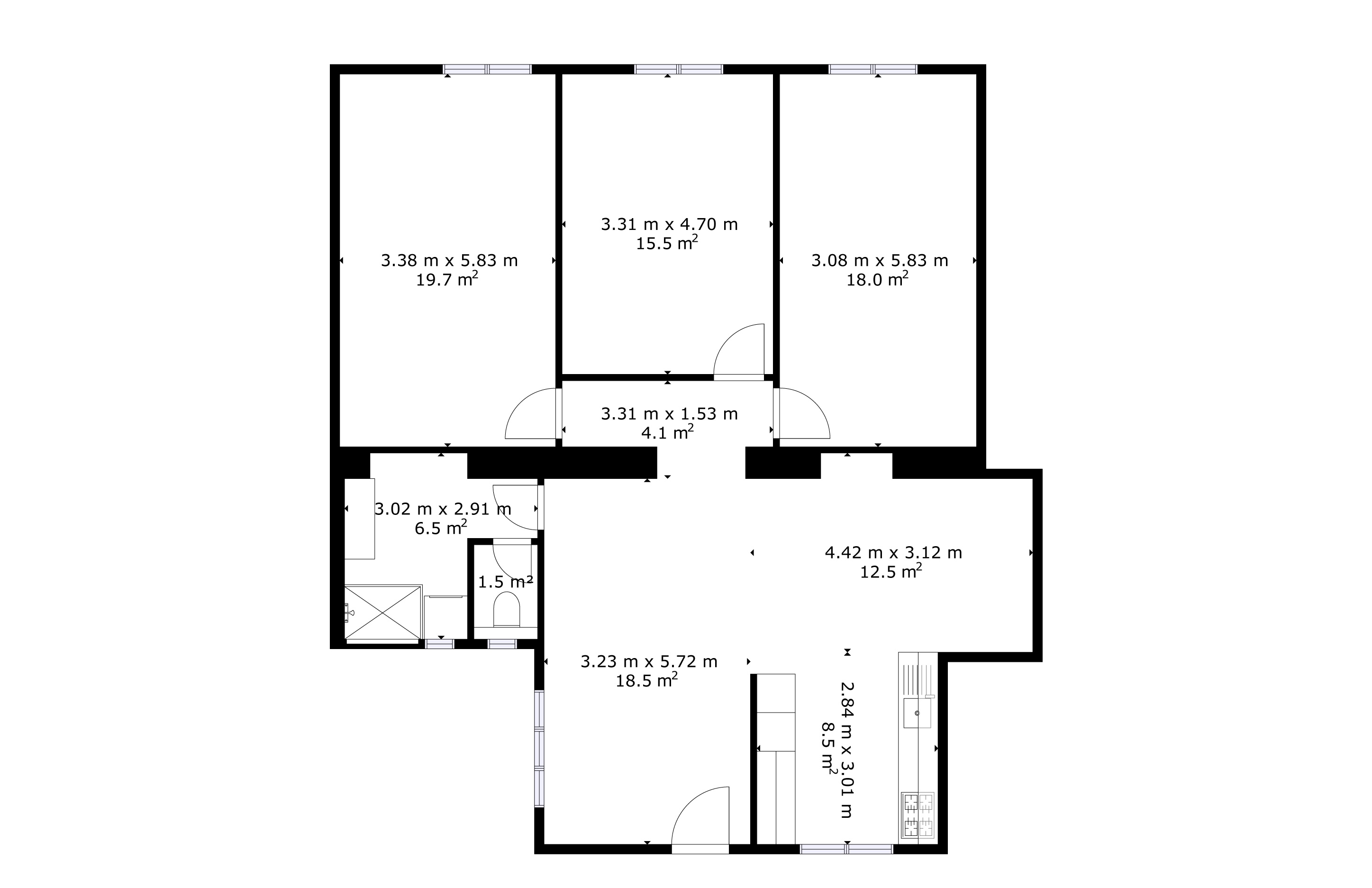 Dispozice bytu nabízí tři samostatné prostorné ložnice, obývací pokoj propojený s moderní kuchyňskou linkou a jídelnou a dále koupelnu se sprchovým koutem. Celý byt je designově sladěn do jednotného stylu. Velkým komfortem je podlahové vytápění v celém bytě. Byt je vytápěn plynovým kondenzačním kotlem, který zajišťuje také ohřev vody.