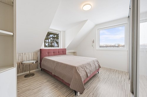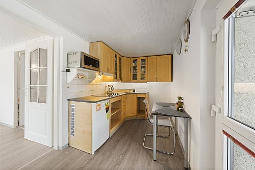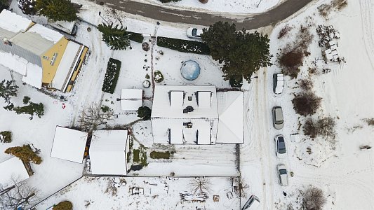 Součástí pozemku je také samostatný menší domek o dispozici 2+kk s vlastní koupelnou se sprchovým koutem. Domek je zateplen a vytápěn tepelným čerpadlem. Tento objekt je ideální pro vícegenerační bydlení, hosty, kancelář, ateliér nebo jako investiční jednotka k pronájmu.